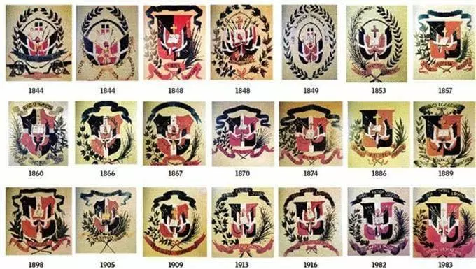Las constituciones de 1844, 1854, 1908, 1916, 1924, 1942, 1966 y 2010, al referirse al Escudo Nacional, coinciden en detallar que “las armas de la República Dominicana son: una cruz, a cuyo pie está abierto el libro de los Evangelios y ambos sobresalen de entre un trofeo de armas. Establecen, además que llevan en una cinta el lema: Dios, Patria y Libertad”, según el estudio de Miguel Estrella Gómez.