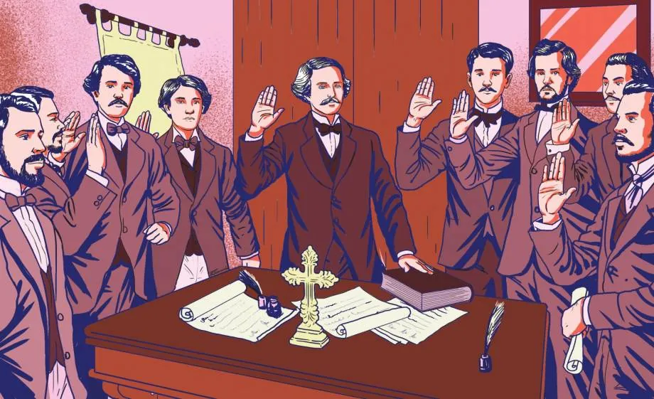 Después de formular tan solemne juramento, cada uno obtuvo sangre propia y firmó con esta tinta roja, símbolo de su propia vida, y dibujó junto a la rúbrica una cruz.