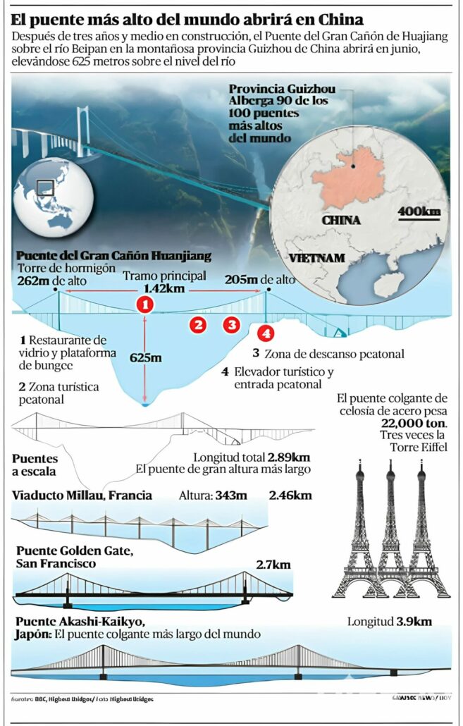 Sin embargo, ninguno combina altura y longitud como el Puente del Gran Cañón de Huajiang.
